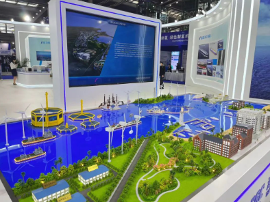 # 10萬噸級大型深遠海養(yǎng)殖工船、2000噸自升自航式風電安裝平臺、耕海一號二期工程等模型以及“藍色海洋經濟綜合體”沙盤,生動展示出“深海養(yǎng)殖+海上文旅+海上風電”互聯互通的繁榮業(yè)態(tài)景象;