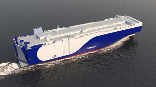 該船型由中國(guó)船舶集團(tuán)旗下上海船院設(shè)計(jì),總長(zhǎng)200米,型寬38米,裝載能力9000車,可運(yùn)輸電動(dòng)車和常規(guī)燃料汽車以及其他類型的重型滾裝貨物。