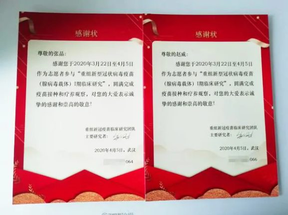 △ 新冠疫苗臨床研究團隊給張晶夫婦頒發(fā)的“感謝狀”